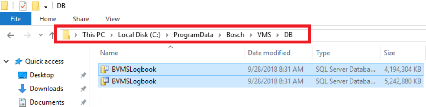 The logbook database is located in C:\ProgramData\Bosch\VMS\DB on the BVMS Management server. Copy the BVMSLogbook.mdf and BVMSLogbook.ldf (using a USB stick or using the network) to the SQL server.
