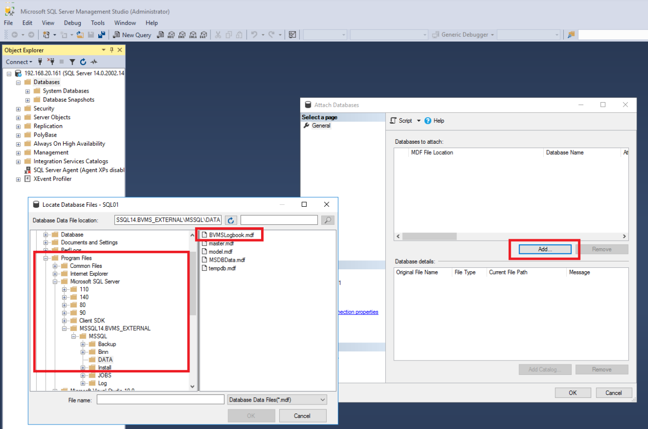 Browse to the C:\Program Files\Microsoft SQL Server\MSSQL.14.BVMS_External\MSSQL\DATA and select the BVMSLogbook database file.
