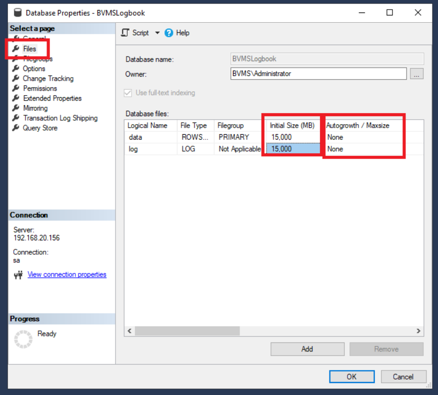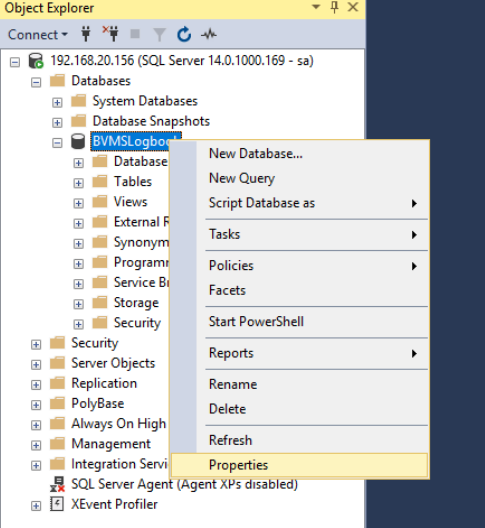 By default, the size of the BVMS logbook has been fixed to 4GB. To allow the logbook to grow, the size of the database needs to be changed. Right click the BVMSLogbook database in the SQL Server Management Studio and click properties.
