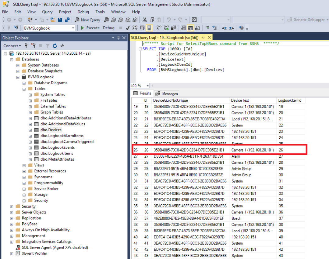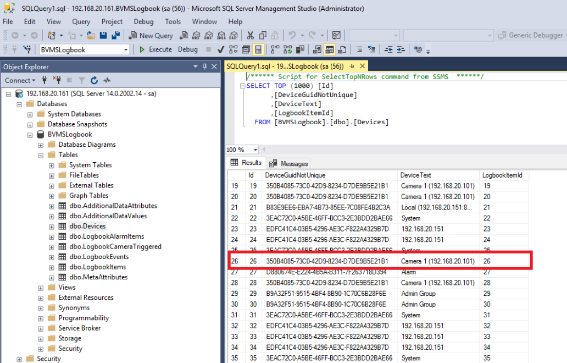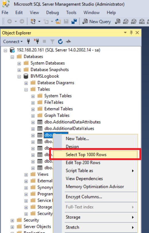 In order to confirm the data migration, the content of the database can be checked by executing a SELECT query on the data. Expand the BVMSLogbook database, go into the Tables folder, right click on the dbo.Devices and click on "Select Top 1000 Rows".