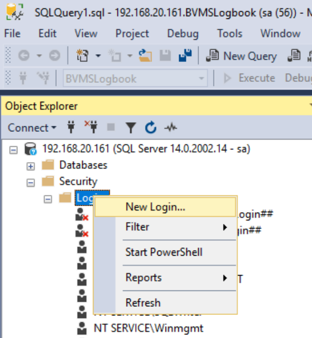It is not recommended to use the "sa" account for BVMS to login to the SQL Server. In this section a separate SQL Server user account will be created.