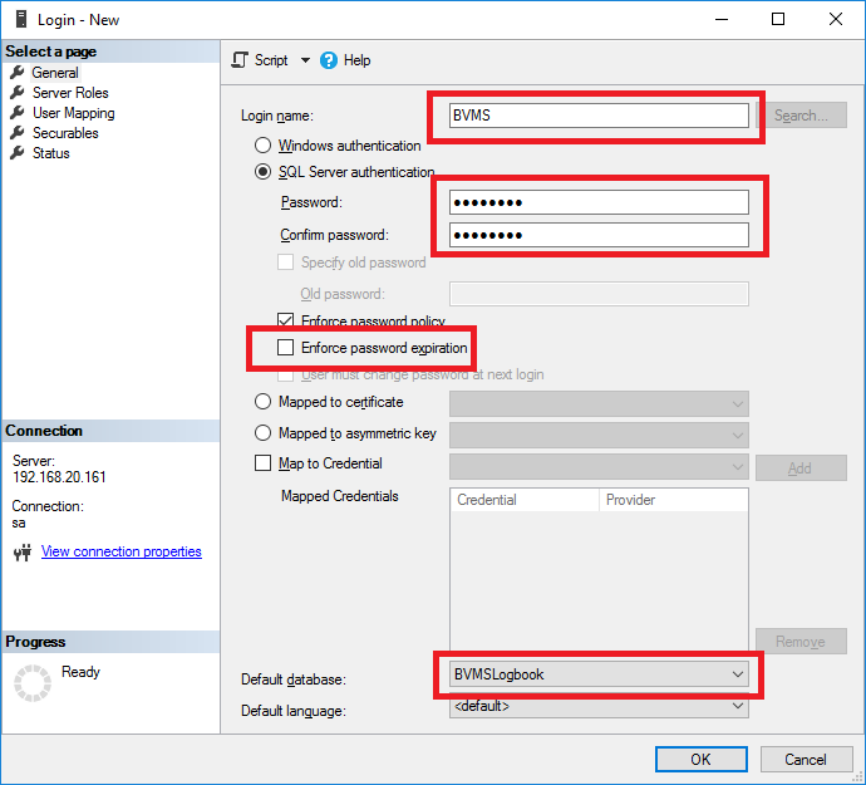 Fill the form with an appropriate user-name and password, deselect Enforce password expiration (in order to prevent the BVMS Management server to lose access once the password has expired) and select the default database (BVMSLogbook).