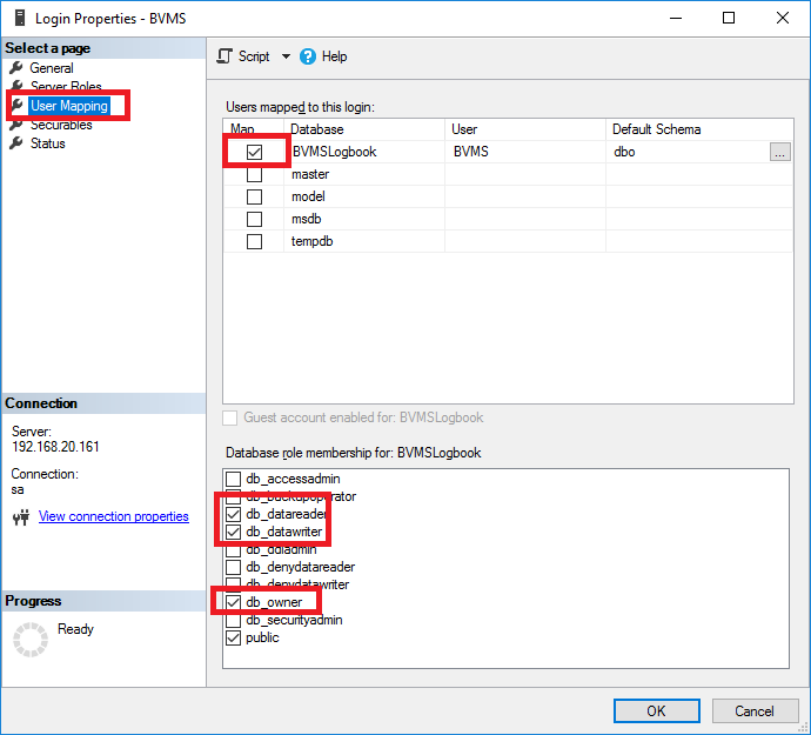 Go to the User Mapping tab, map the user to the BVMSLogbook database and enrol the user as db_datareader, db_datawriter and db_owner to the database.