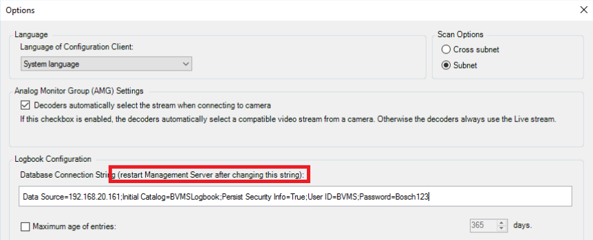 Now that the database is configured and the access is tested, BVMS needs to be re-directed to the new location of the logbook database.