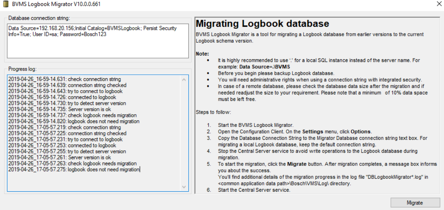 To allow system administrators to upgrade the database schema manually, the DbLogBookMigrator has been created. This tool can be found in the C:\Program Files\Bosch\VMS\bin directory (DBLogbookMigrator.exe). Start the tool, enter the SQL Server connection string (as entered in section 4.1) and start the migration process. The progress log will show an indication of the result.
