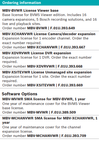 The order number for expansions in BVMS Viewer can be found in the Data Sheet (e.g. BVMS Viewer 11.1.1)