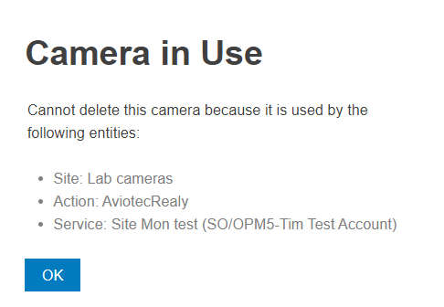 - “Camera in Use” → "Cannot delete this camera because it is used by the following entities:”