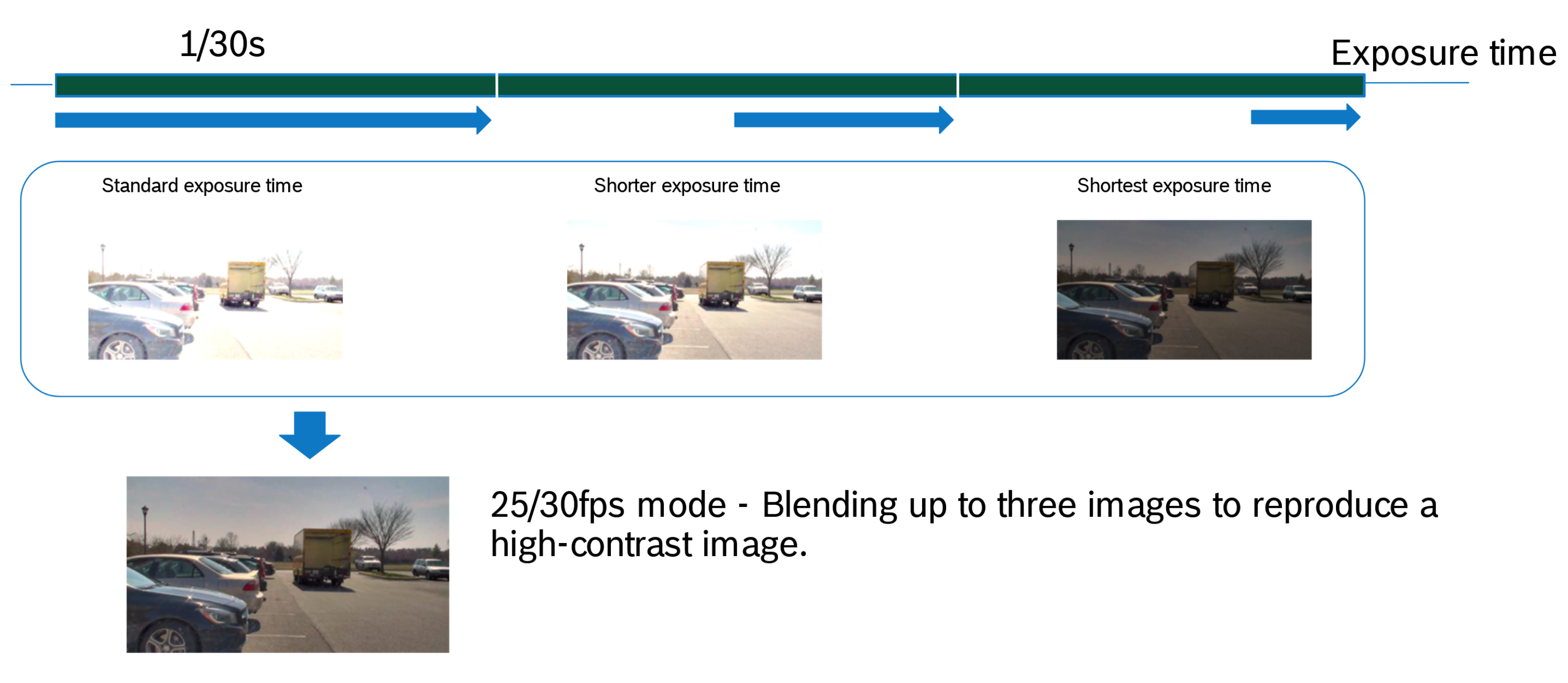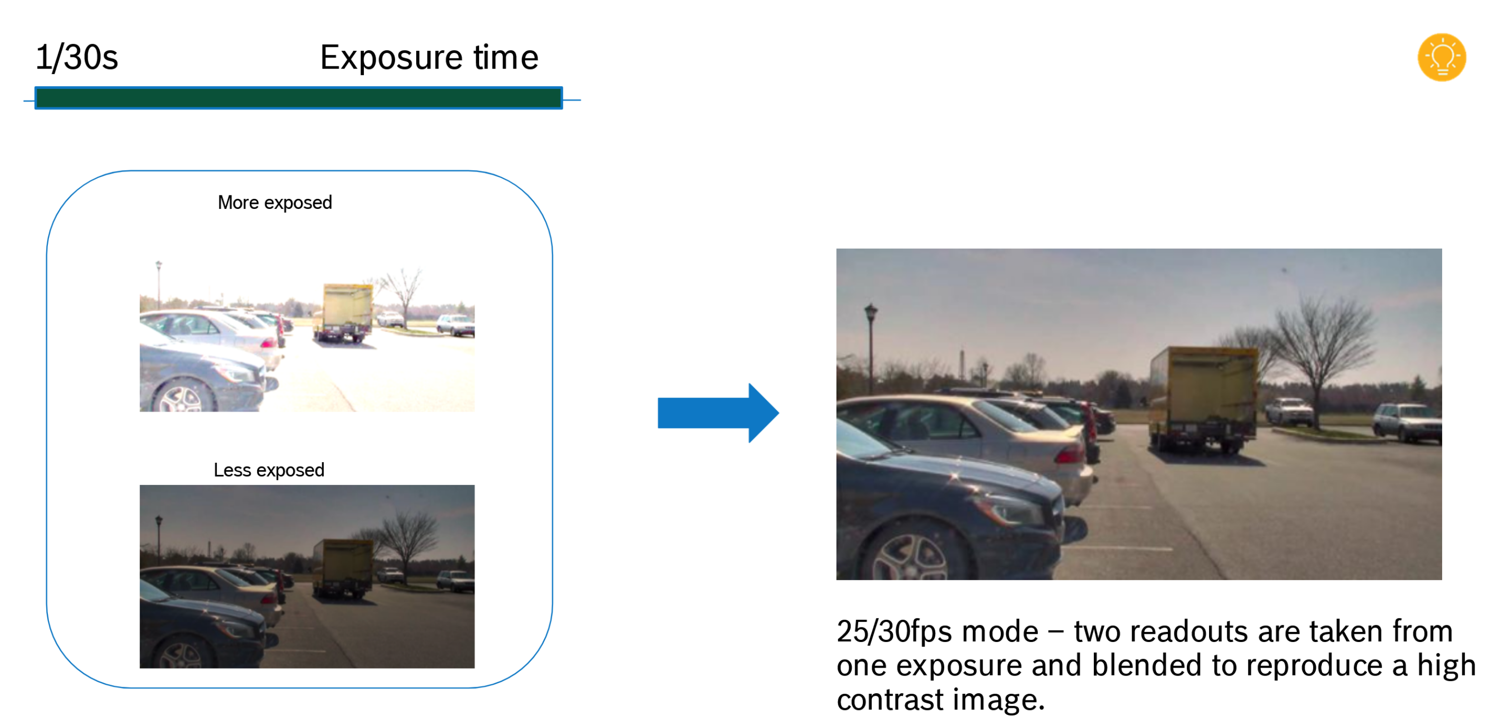 a combination of large pixel sensors, custom-optics, and Bosch imaging algorithms, generates two readouts from one short exposure with different gain levels.