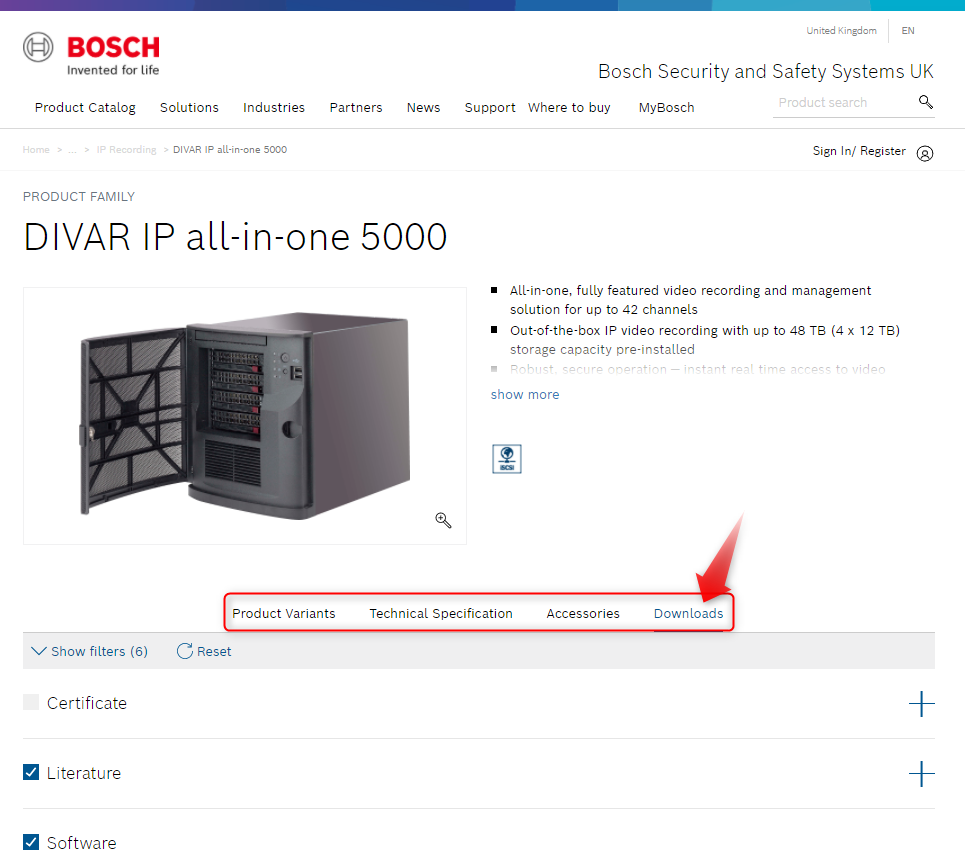 All software, patch installers, technical specifications, accessories and other useful information of the unit can be found on the product page from the Bosch Security and Safety Systems officially web page.