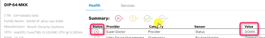 Update: If the SuperDoctor service is not running, the health icon of the specific DIVAR IP in Remote Portal will be colored red and its VALUE is depicted as DOWN.