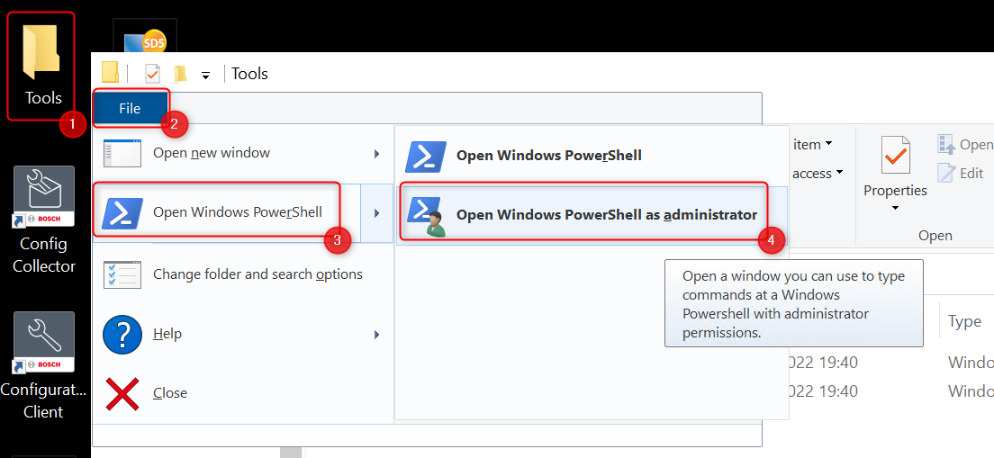 - Use the menu bar on top of the windows explorer and select Files → Open Windows Power shell → Open as Administrator