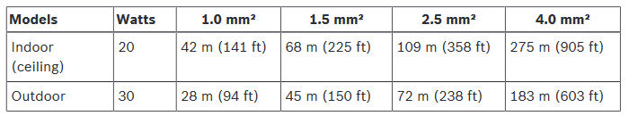 For example, for the AUTODOME IP 5000i requires either 20 W (indoor) or 30 W (outdoors). At 20 W, and with the minimum cable diameter of 1.0 mm², the recommended transmission distance is 42 m (141 feet) from the 24 VAC power supply.