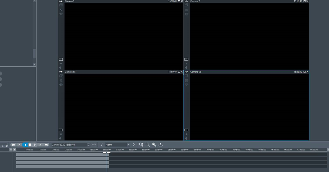 The timeline is present, but the recordings appear to be black for all cameras.