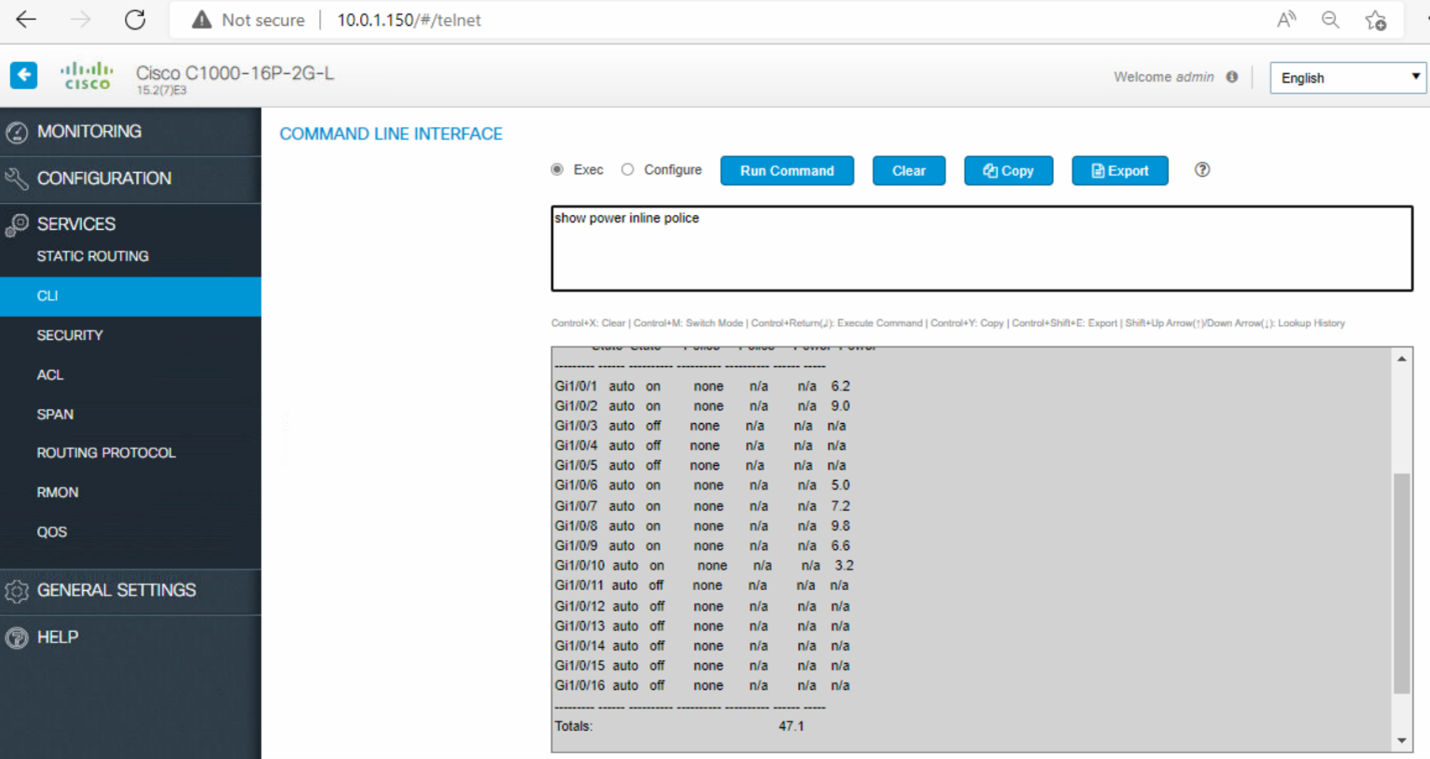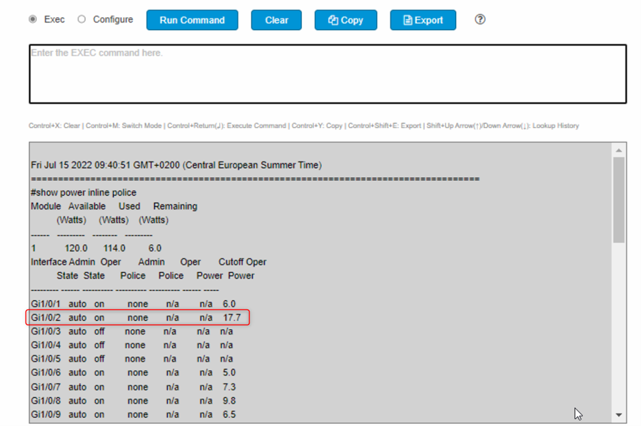 - To see the active consumption per port, send CLI “show power inline police”.