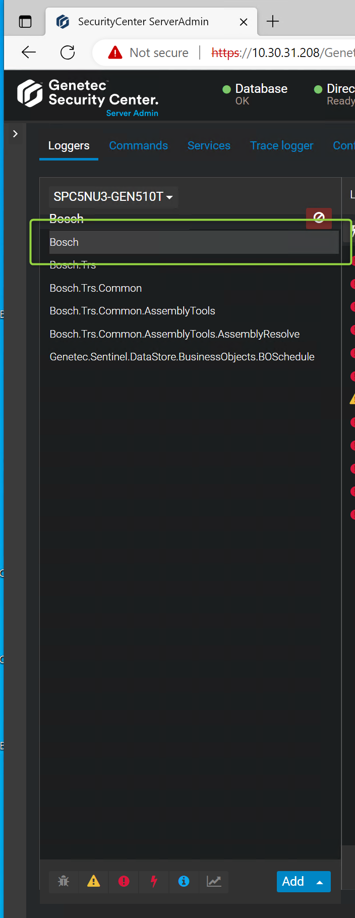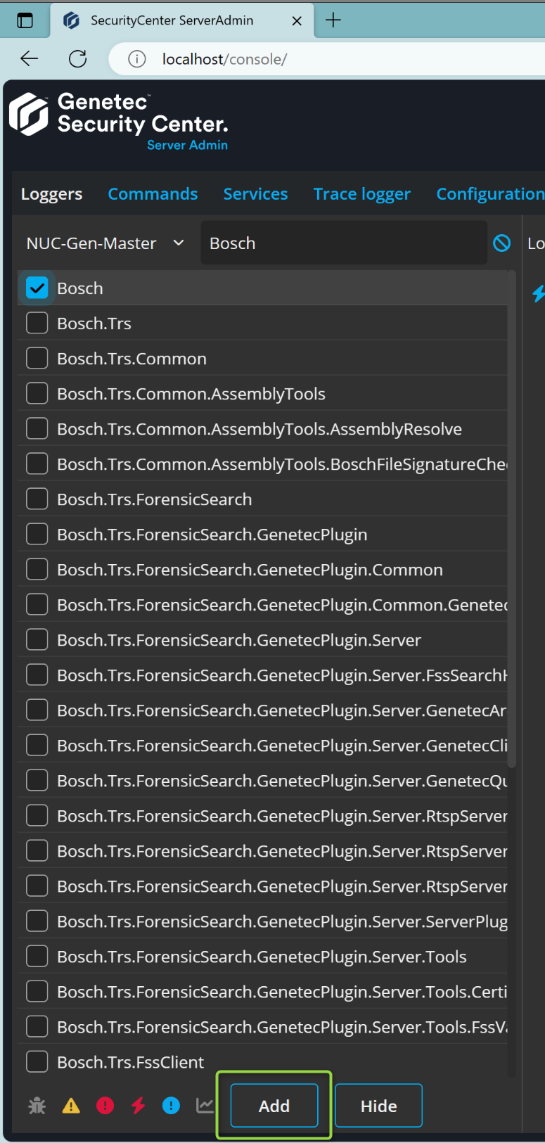Pick the 'Bosch' logger to subscribe to the Bosch specific messages