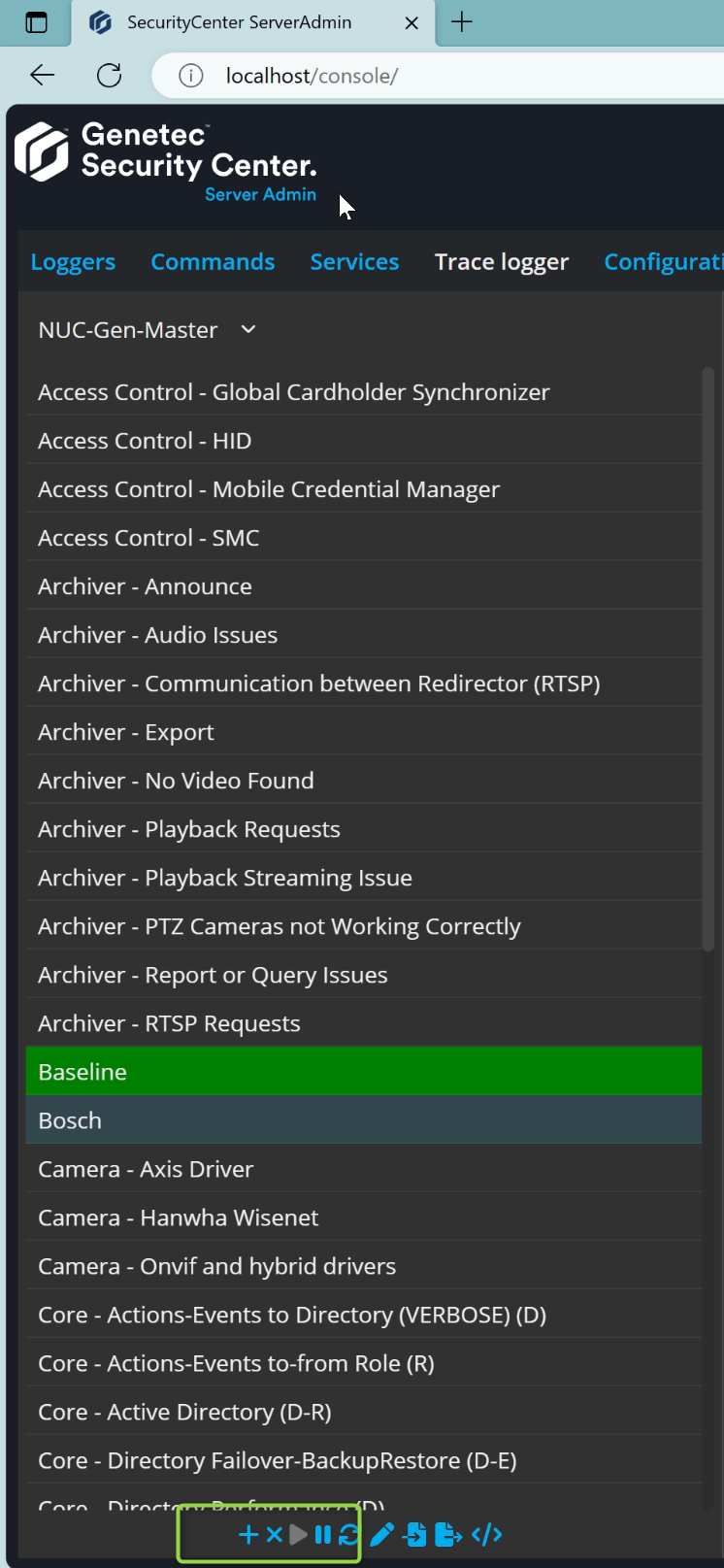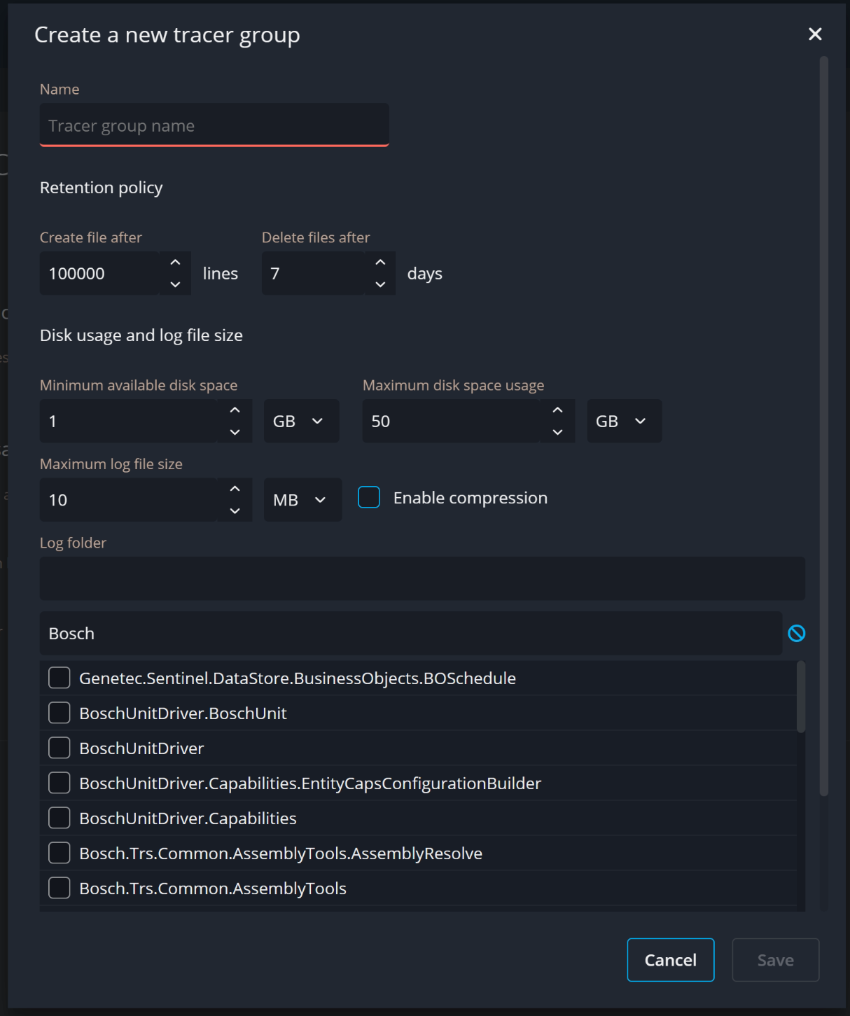 The trace logging is similarly activated in Genetec as the normal loggers, except that a file and some file parameters need to be specified as depicted below: