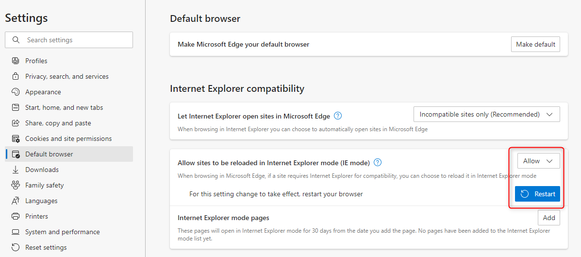 - Under the “Internet Explorer compatibility” section, turn on the “Allow sites to be reloaded in Internet Explorer mode” by choosing "Allow" from the drop-down list,