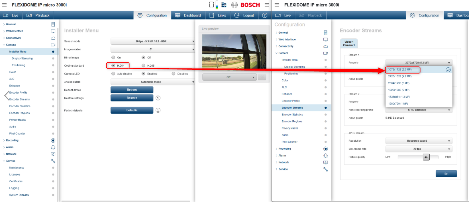 For FLEXIDOME IP 3000i 5MP series, using H.265 limits the maximum resolution to 4.2 MP. The maximum resolution of 5.3 MP can only be achieved with H.264 encoding