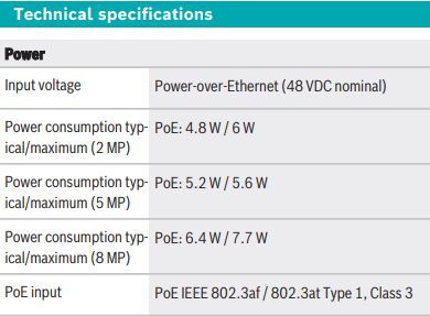 For example, the FLEXIDOME indoor 5100i camera supports IEEE 802.3af/ 802.3at Type 1: