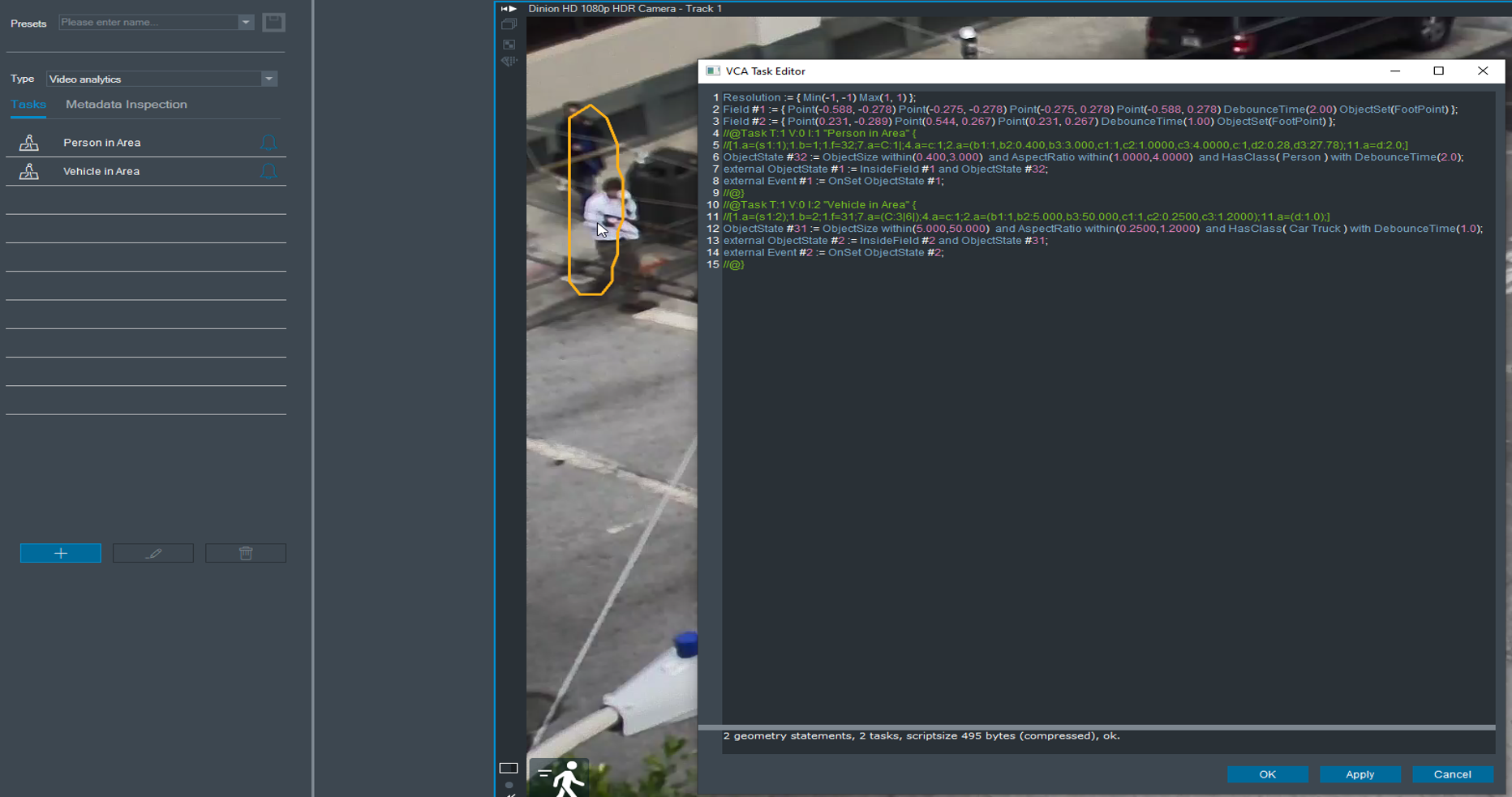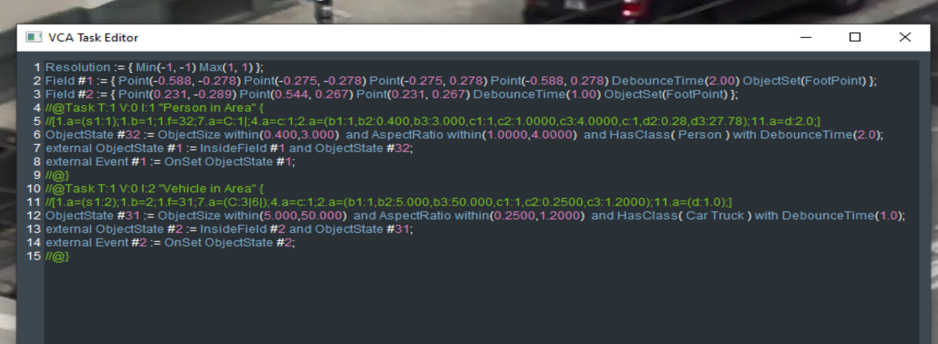 Get some playback, use forensic search to fine tune the tasks and transfer the Task syntax (copy it) to the camera VCA settings.