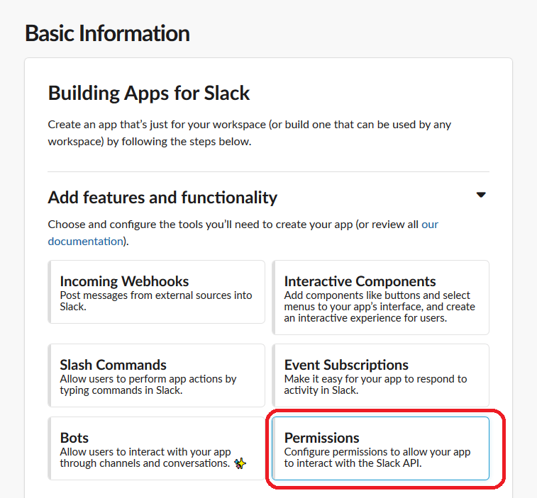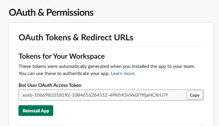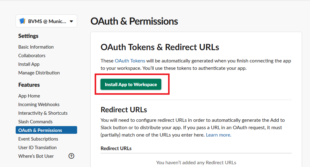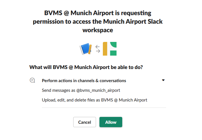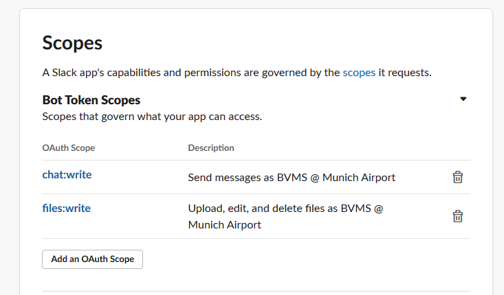We need to give the app the permissions to post messages and files into the work-space.