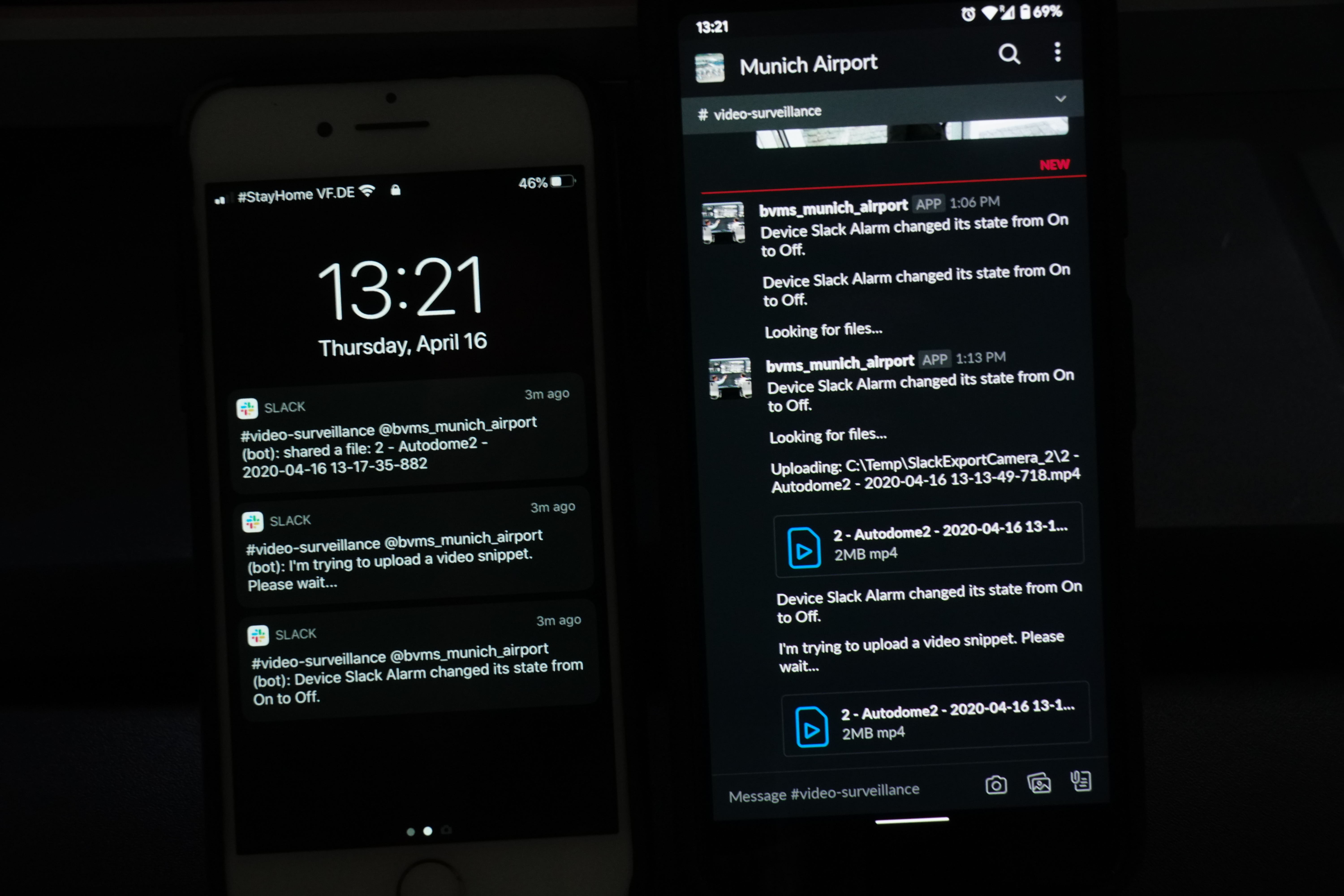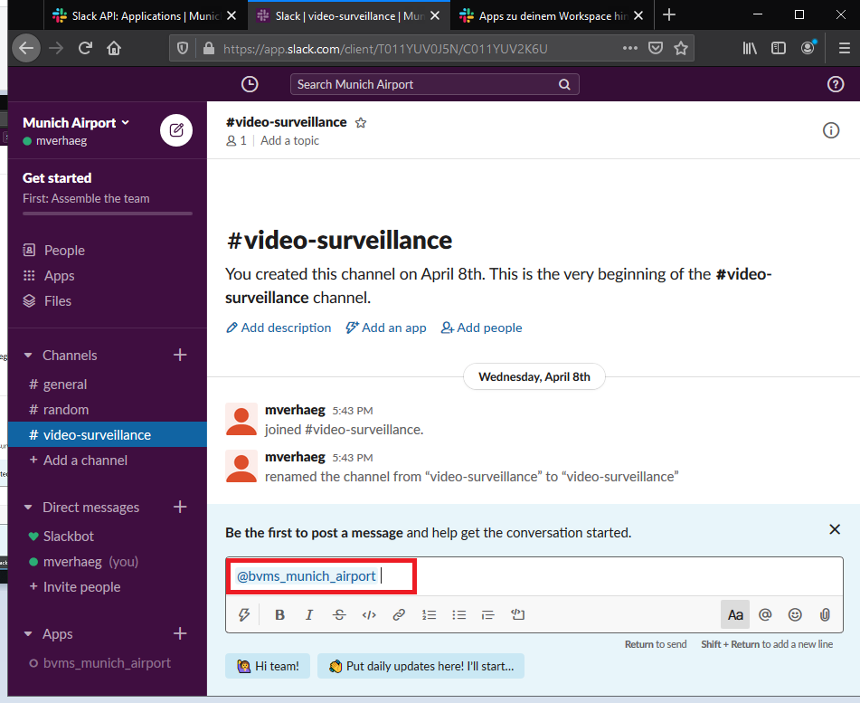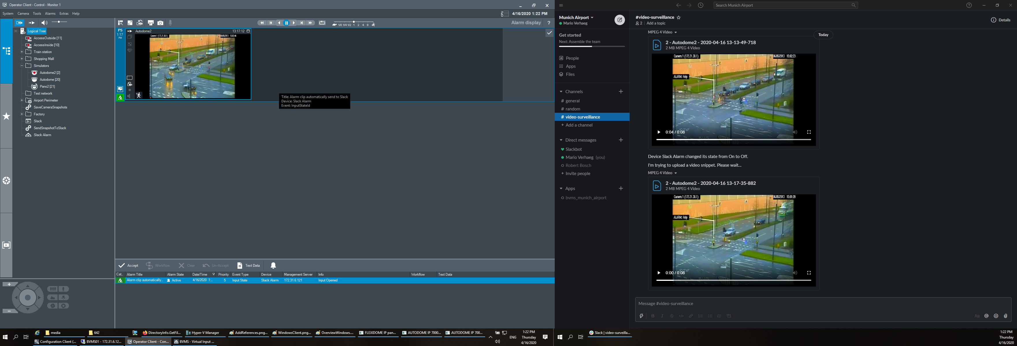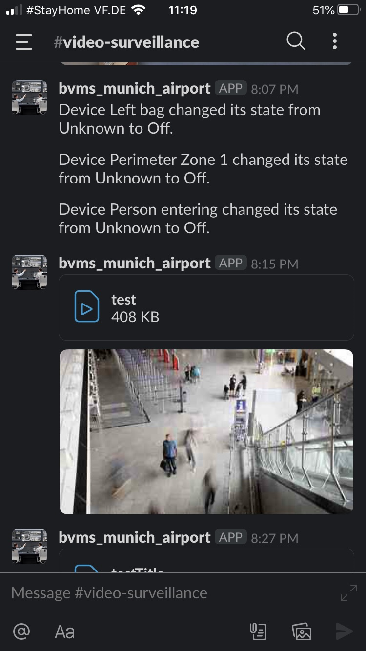 Security guards as well as operators are all member of this Slack channel and use the channel to collaborate. Guards can use their mobile phones to upload still images or movies to the channel for archiving by the security operators. Security operators are able to send snapshots (directly from BVMS), videos (exported), or chat messages to instruct security guards.