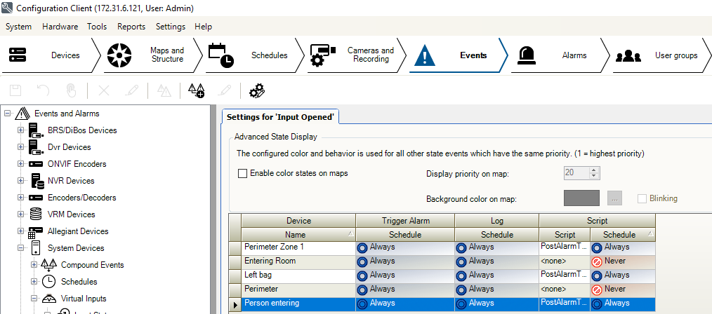 Attach the server script to those events. The script will automatically extract the device name, old state, and new state from the event. Alternatively, the file upload script will attach a small video clip to the message of the event.