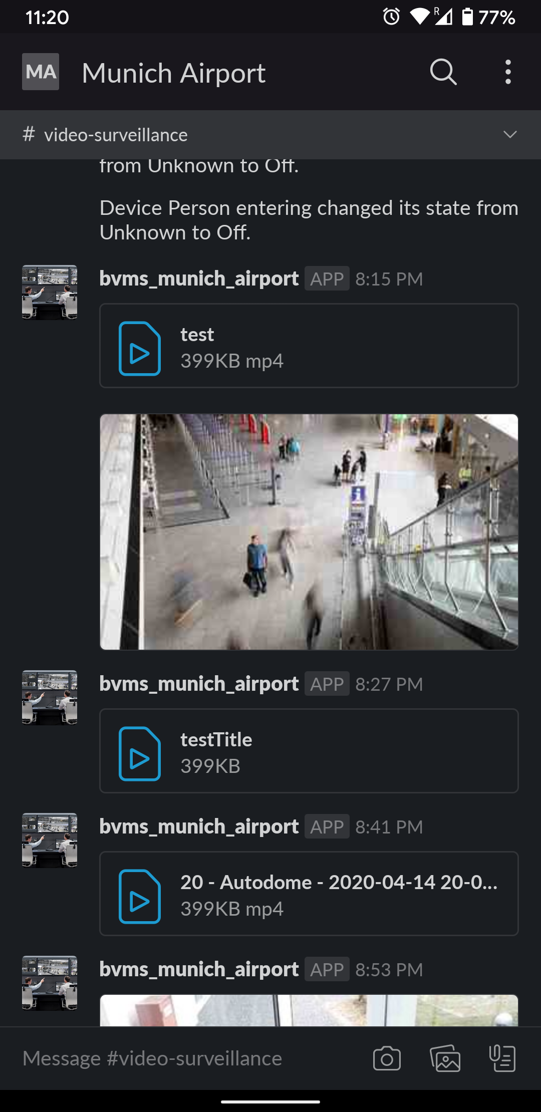 Upload files into the Slack channel. You need to create a server script for each camera for which we want to upload small clips.