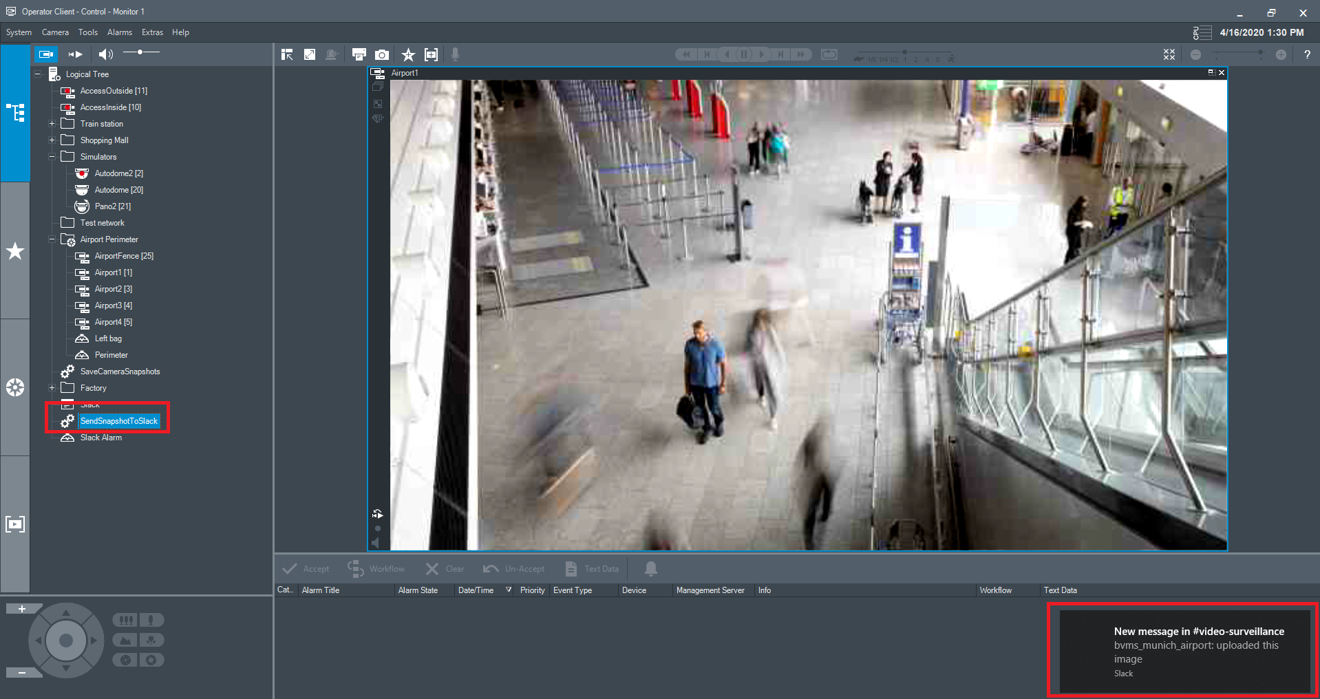 We use the same SlackCommunication class. We create a small client script that saves the current view of an image pane and sends this to the Slack channel.