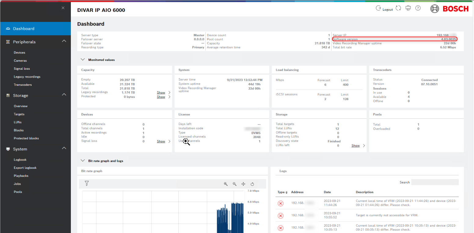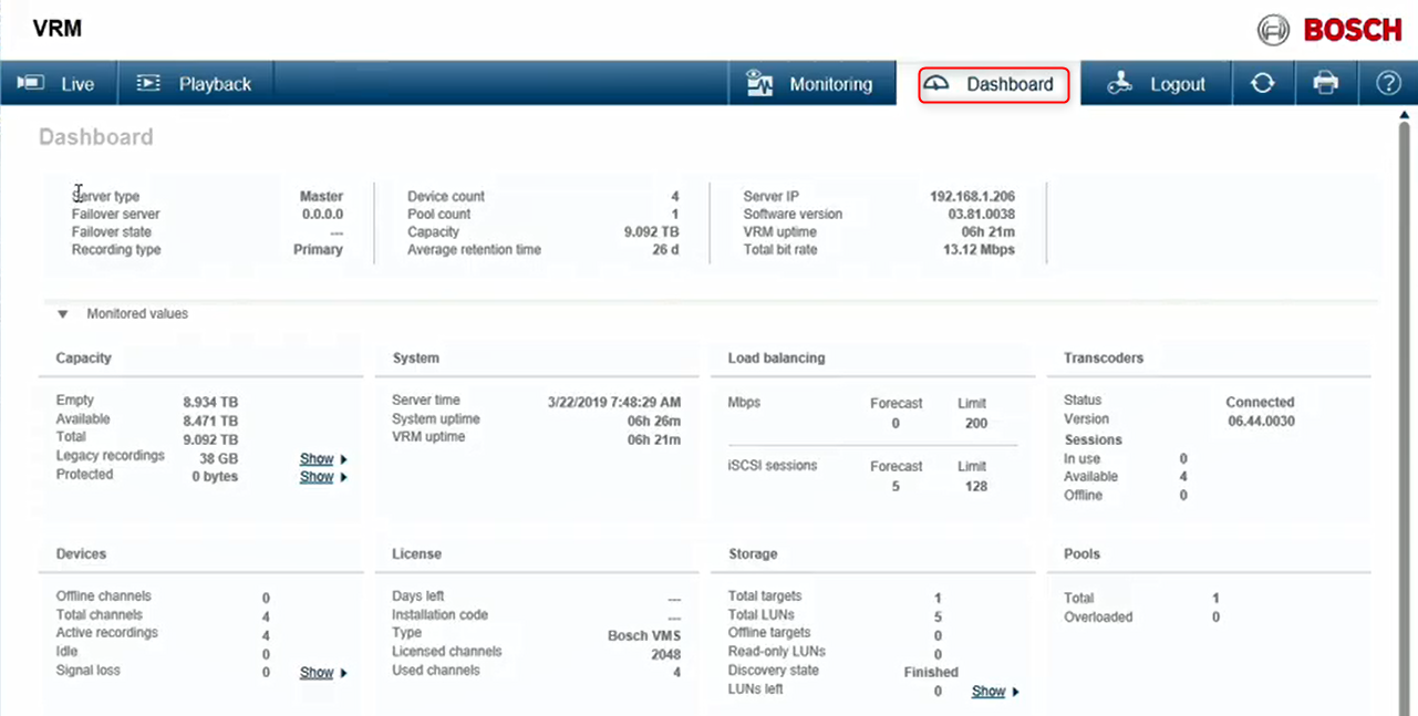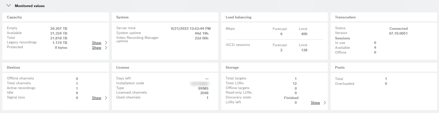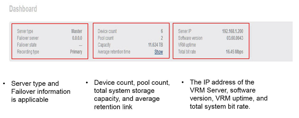 In this article you are going to see how to access VRM Monitor from Bosch Video Management System (BVMS) Configuration Client. Furthermore, you will find here some useful information about each section on the Dashboard page.