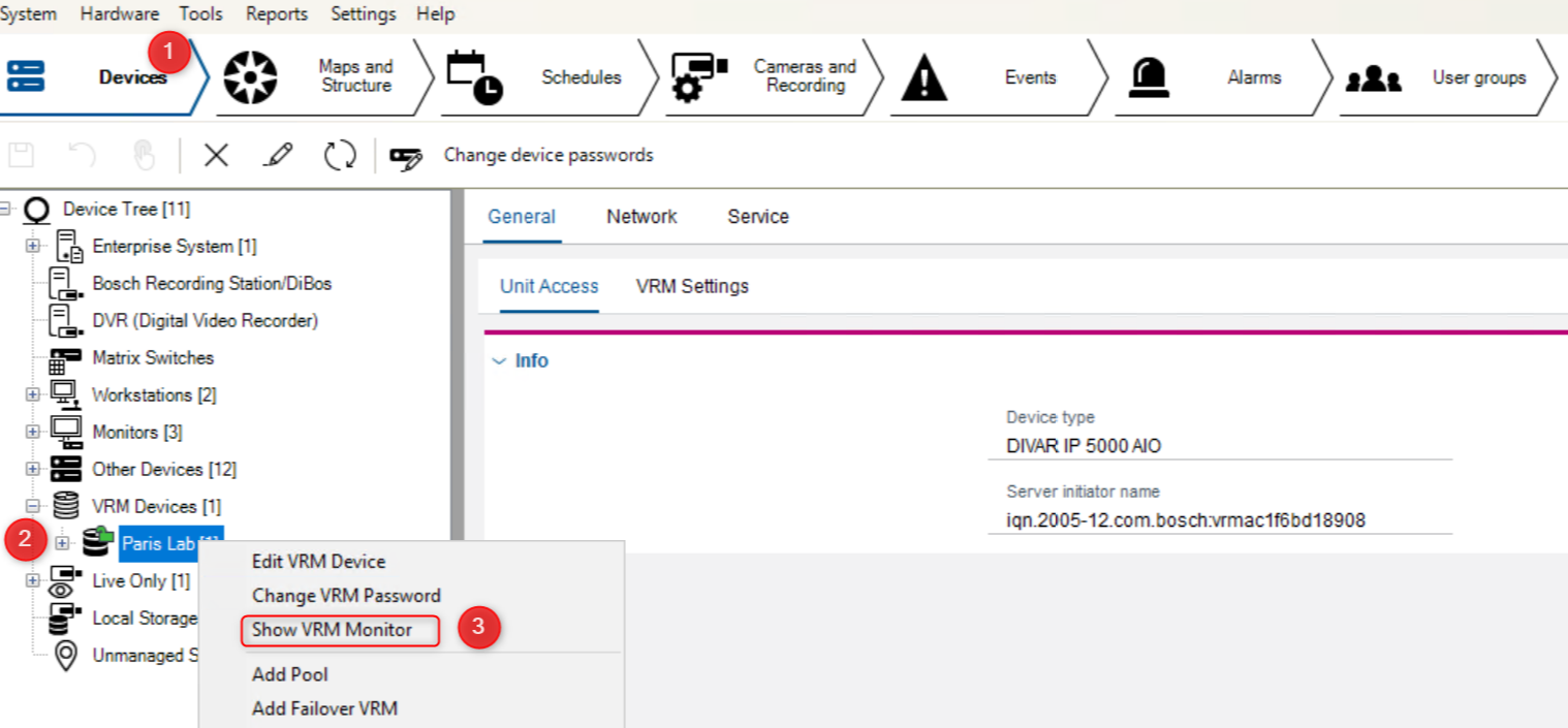 - Form the Devices tab > expand the VRM Devices > go to your VRM device >right click on it and select Show VRM Monitor
