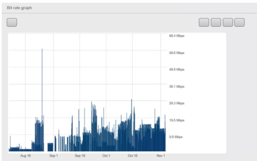 - The Bit Rate Graph provides real time data of the system’s network throughput to the storage devices. The graph provides filter options that allow the following: 1hour, 1 day, 1 week, or 1 month. There is also the option of filtering based on a date-to-date basis.