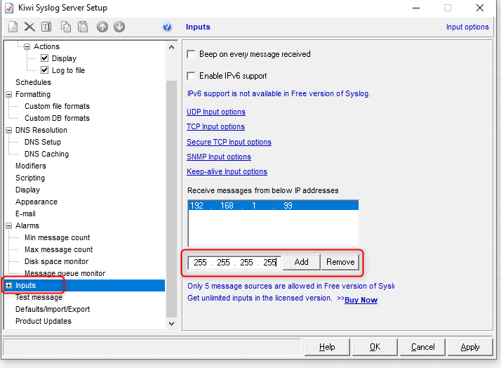 Example configuration for KIWI syslog free edition to receive and save the syslog send by the camera:
