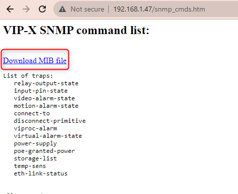 For IP camera operating on firmware 7.50.xxx and below, you can find it on the web page of the camera, using the following url : http://camera ip/snmp_cmds.htm. For example a camera with 192.168.10.1 IP address, the command looks like the following: http://192.168.10.1/snmp_cmds.htm