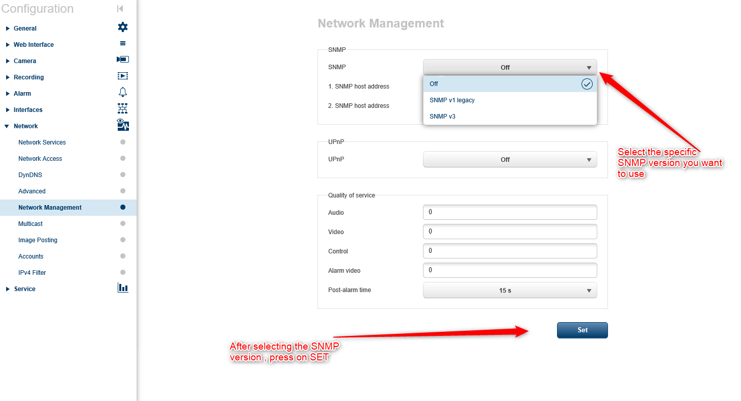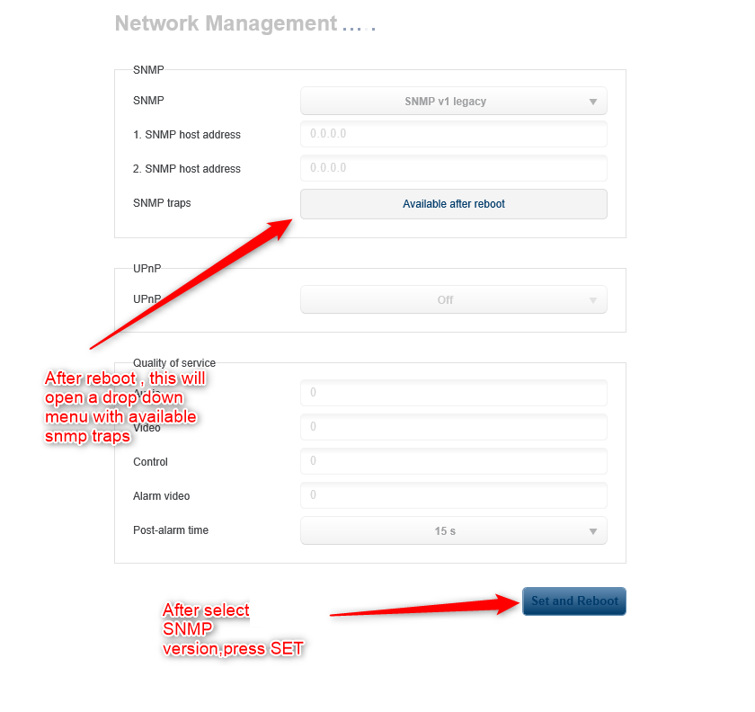- Select the desired SNMP version (v1 or v3) , click on Set > Set and Reboot