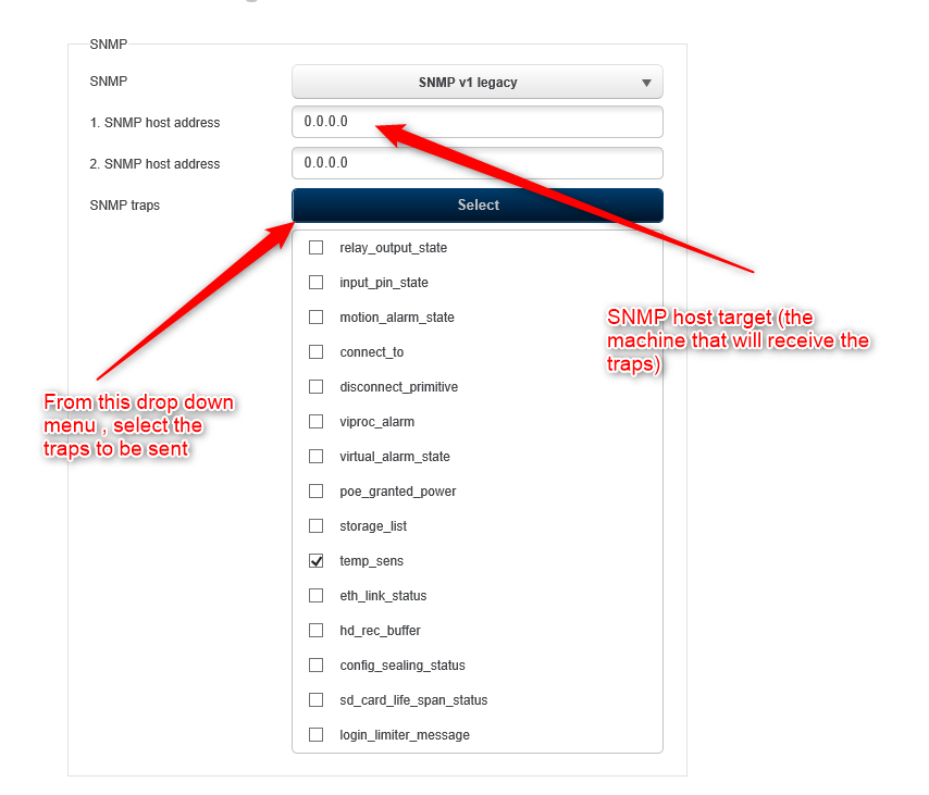 - After the camera reboots, enter an SNMP Host address (where the traps will be sent). Select from the dropdown menu of the SNMP Traps > the desired traps that you wish to be sent