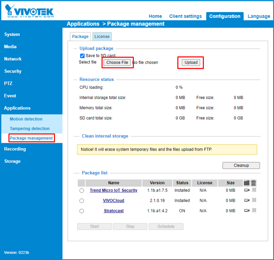 3. Login to the camera using the password and navigate to Configuration > Applications > Package management and upload the application package:
