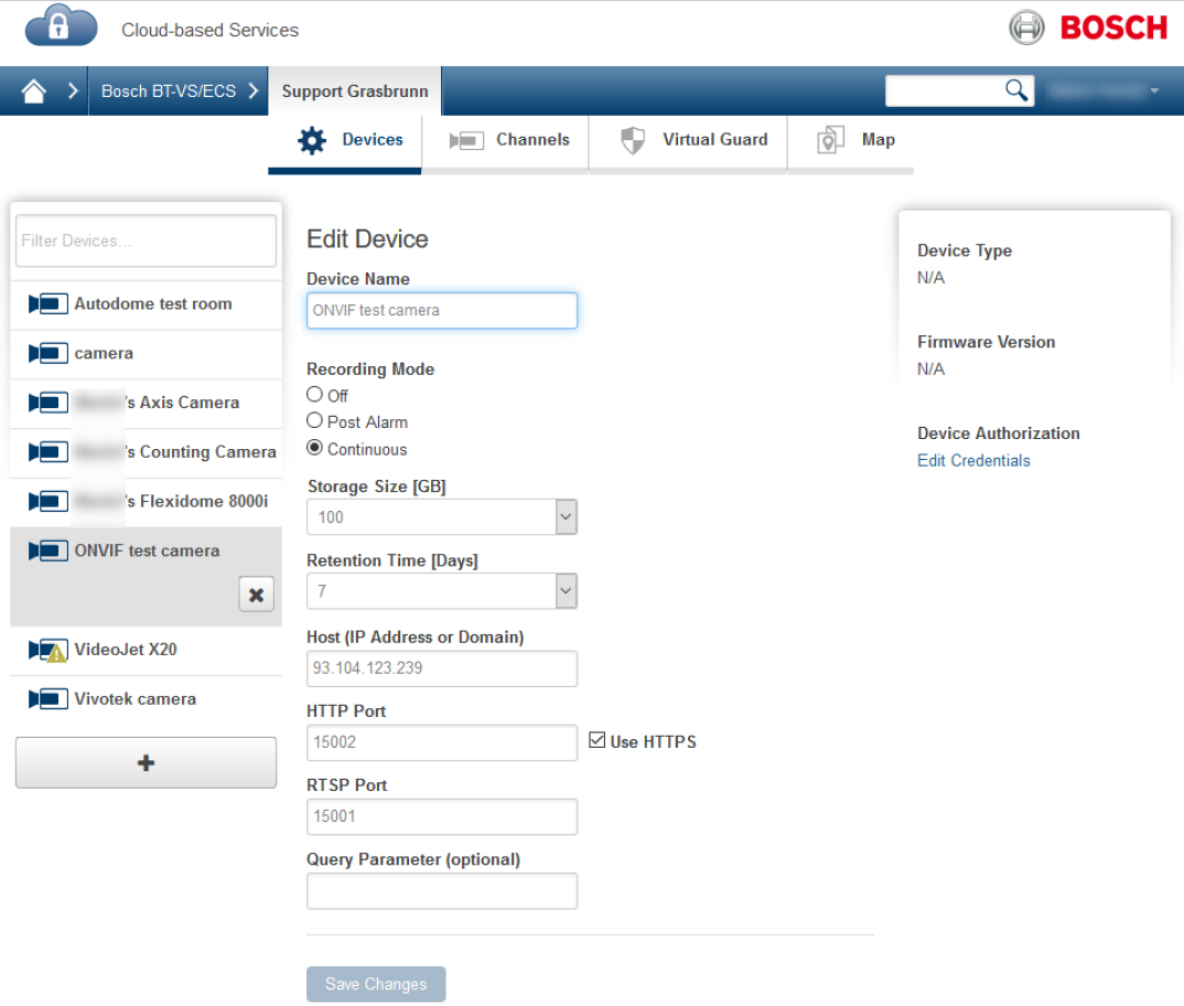 3. Enter device name, host (public IP address or domain), HTTPS and RTSP ports, and camera credentials (user name and password).