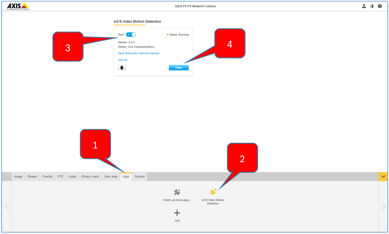 5. Select "AXIS Video Motion Detection" app (2), start the app (3) and configure motion detection (4).