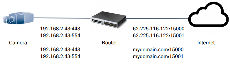 To add a 3rd party ONVIF camera to Bosch Alarm Management, port forwarding needs to be configured for each camera in the Internet router.