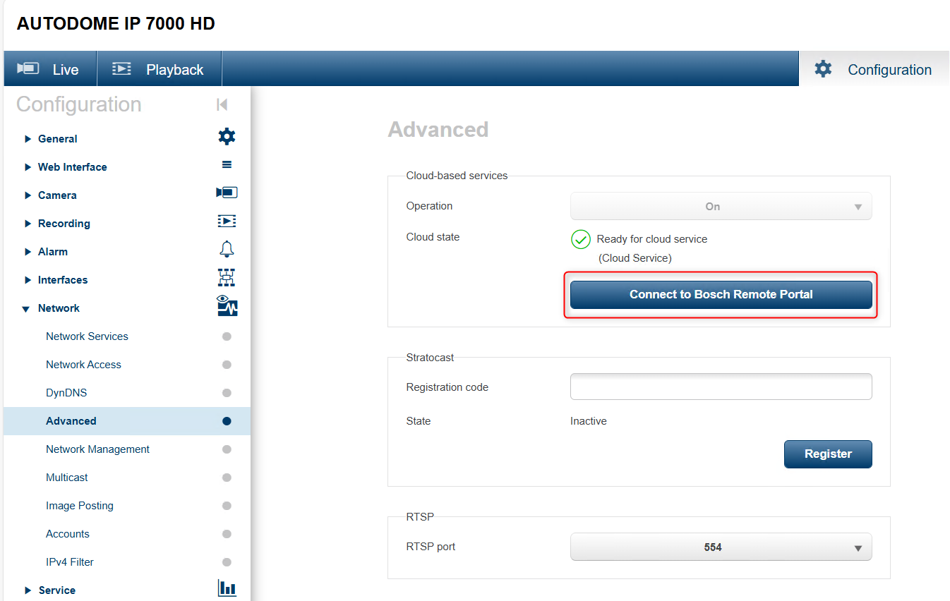 Note: In Firmware versions earlier than v.7.70, the camera can be registered to Remote Portal under Network > Advanced tab.