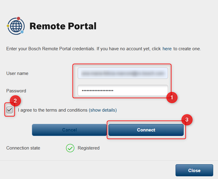 7. Enter your user name and password of Remote Portal (Admin or Technician) and click Connect button