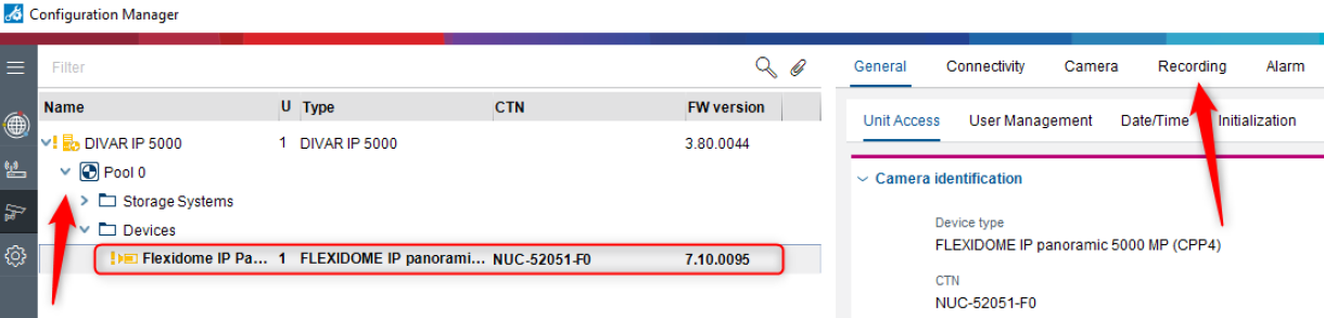 6. A blue arrow appears next to the unit. > Expand the arrows as below, click on the camera and select Recording from the right side menu: