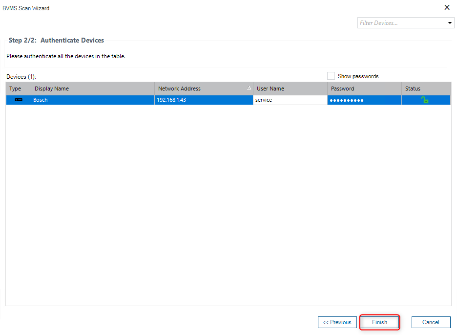 Fill in the credentials of the camera (username and password). If the camera is protected with a password, type in the password of it > Click "Finish"