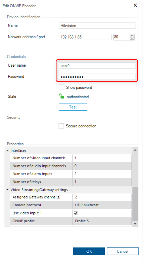 Type in the name of the camera, its IP Address, credentials (username & password) > Click "OK"