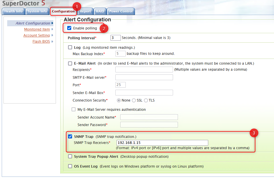 1. Open the Super Doctor software and go to Configuration > tick the box next to the "Enable polling" > add the IP address of the SNMP Trap Receiver (in this example - the BVMS server) and click Save
