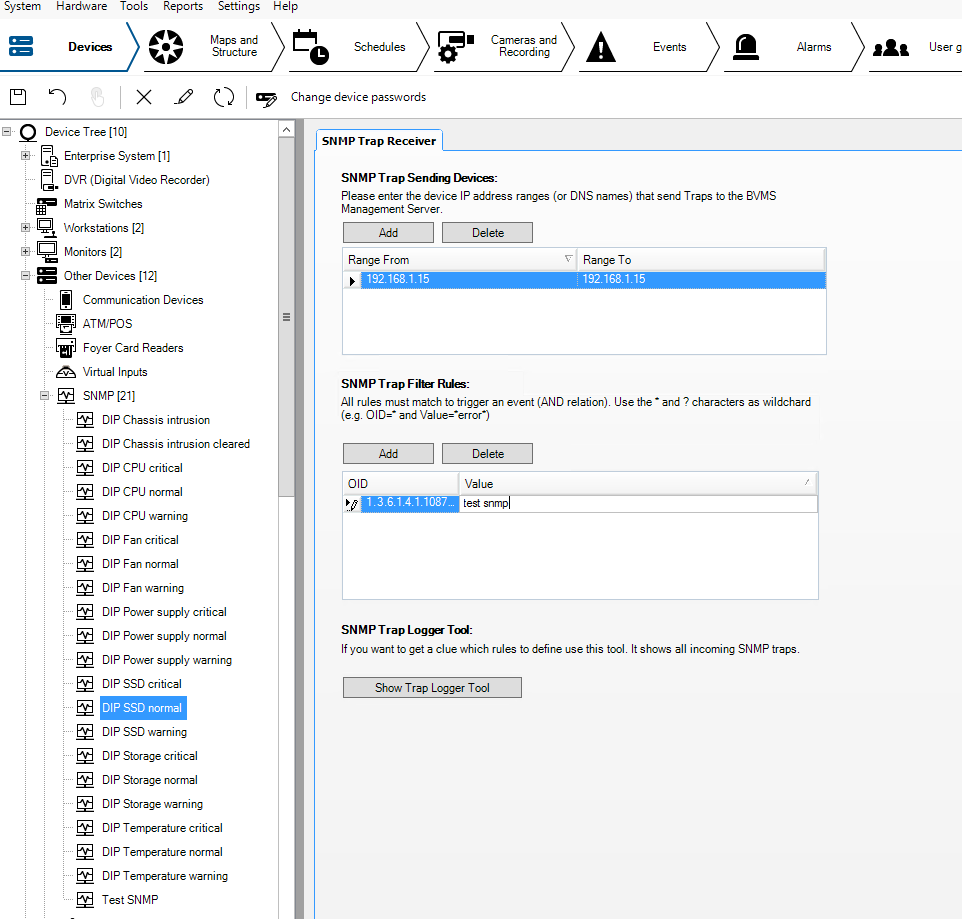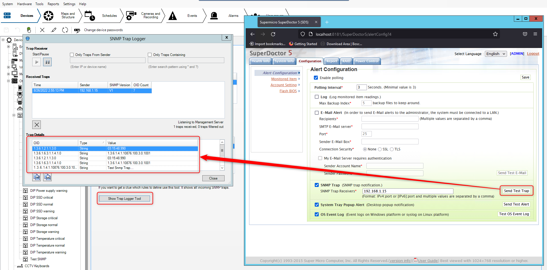 Note: You can trigger a test trap in the Super Doctor tool and check in the Logger tool whether it is received fine: