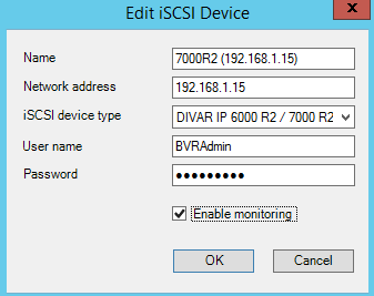 When adding or edditing an iSCSI device to a VRM storage pool, the dialog is extended by an additional checkbox where the monitoring can be enabled.