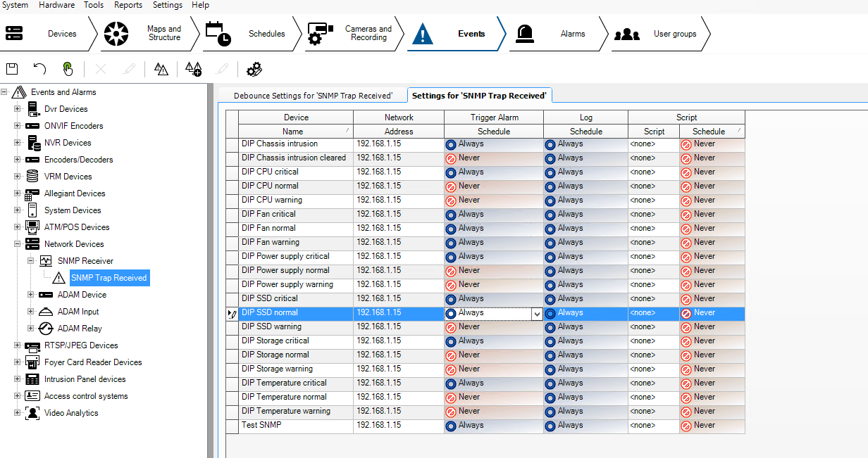In this example, we'll focus on the DIP Power supply critical where the Trigger Alarm should be set as "Always" in order for Operator Client to receive the alarms.
