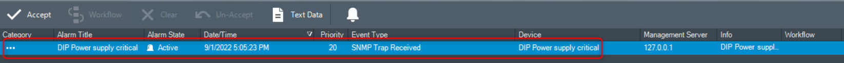 The received trap is forwarded to the BVMS Alarm Management and can be processed further as any other native Event/ Alarm in BVMS.
